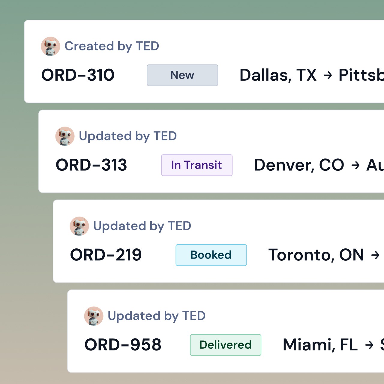 Your email assistant that’s always working. TED turns emails into orders, keeps orders updated with every email update, and syncs your documents directly into the TMS.